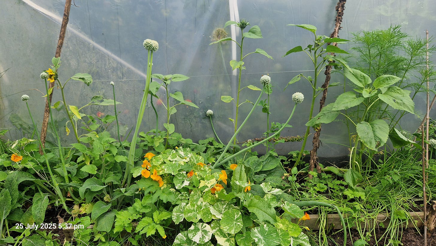 Sunflowers – Some sown, some sprouted from dried heads left in the tunnel last year. Not all are flowering yet, but they’re thriving.